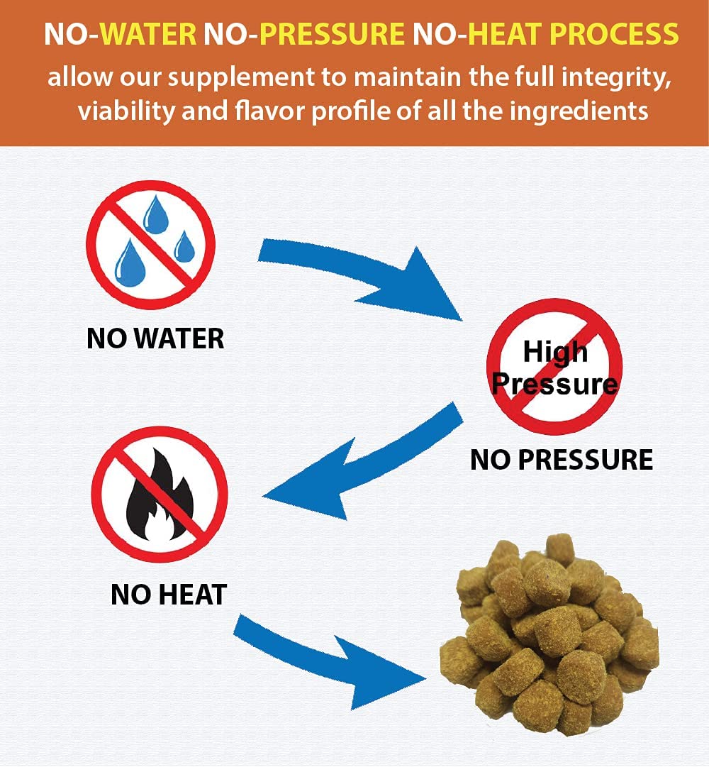 Why are our chews the best dog supplement for joints? Most supplements on the market today are extruded and cooked. So, we developed a unique recipe and use a processing technique that produces a premium hip and joint supplement. Our no water, no pressure, no heat process allows us to maintain the full integrity, viability, and flavor profile of all the ingredients. Other products can’t compete with this level of quality.